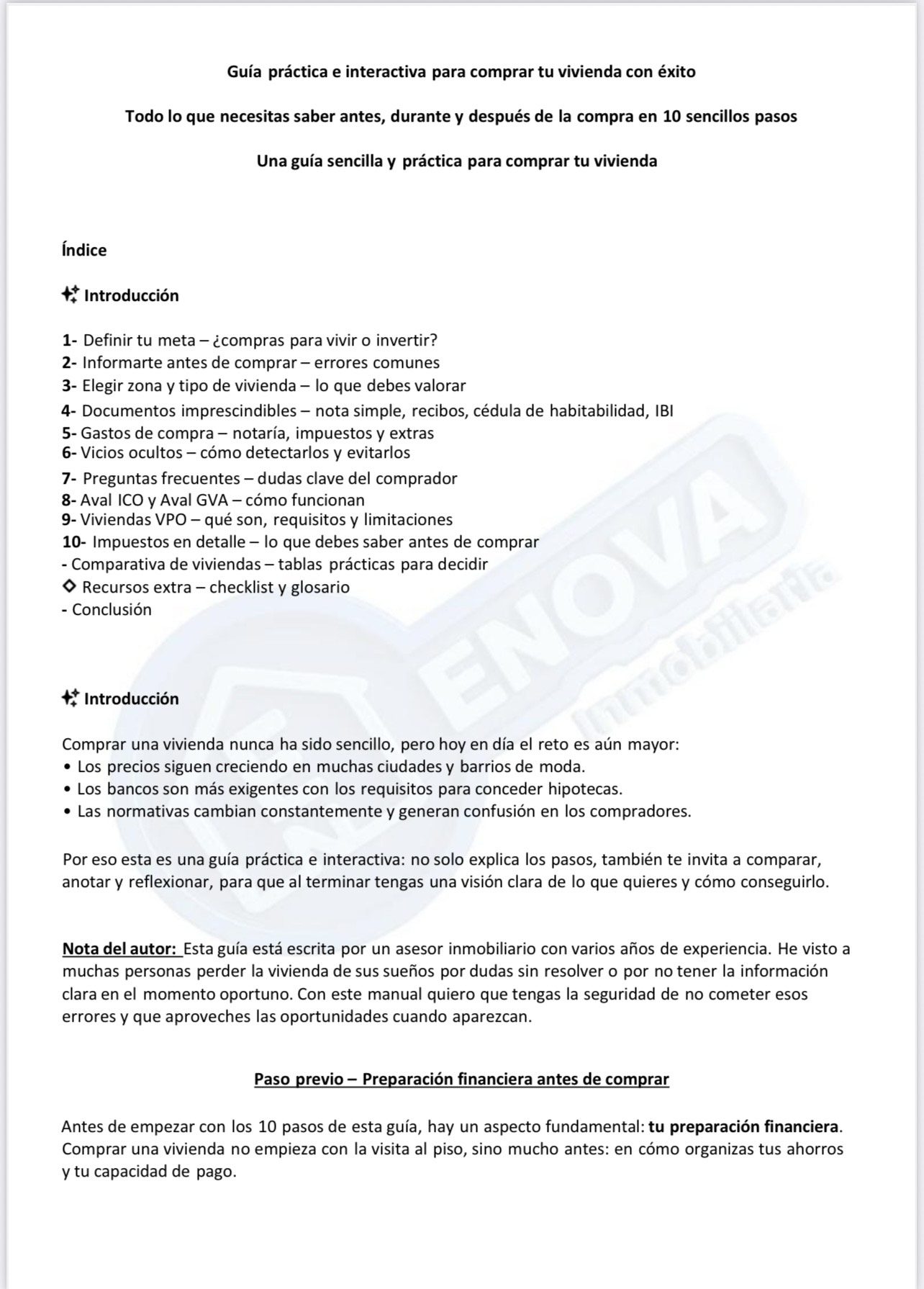 📘 Esta guía es la herramienta definitiva para quienes desean comprar su vivienda con seguridad, sin cometer errores y con la confianza de contar con la experiencia de profesionales inmobiliarios. En ella encontrarás: ✅ Los 10 pasos esenciales para comprar tu casa en 2025. ✅ Espacios interactivos para anotar tus ideas, necesidades y cálculos. ✅ Una checklist práctica con todos los gastos y trámites que no debes olvidar. ✅ Consejos profesionales de ENOVA Inmobiliaria, con transparencia y cercanía. 🔑 Ideal para: Compradores primerizos que quieren dar el paso con seguridad. Personas que buscan optimizar su inversión y evitar imprevistos. Cualquiera que quiera entender el proceso de compra de forma clara y ordenada.